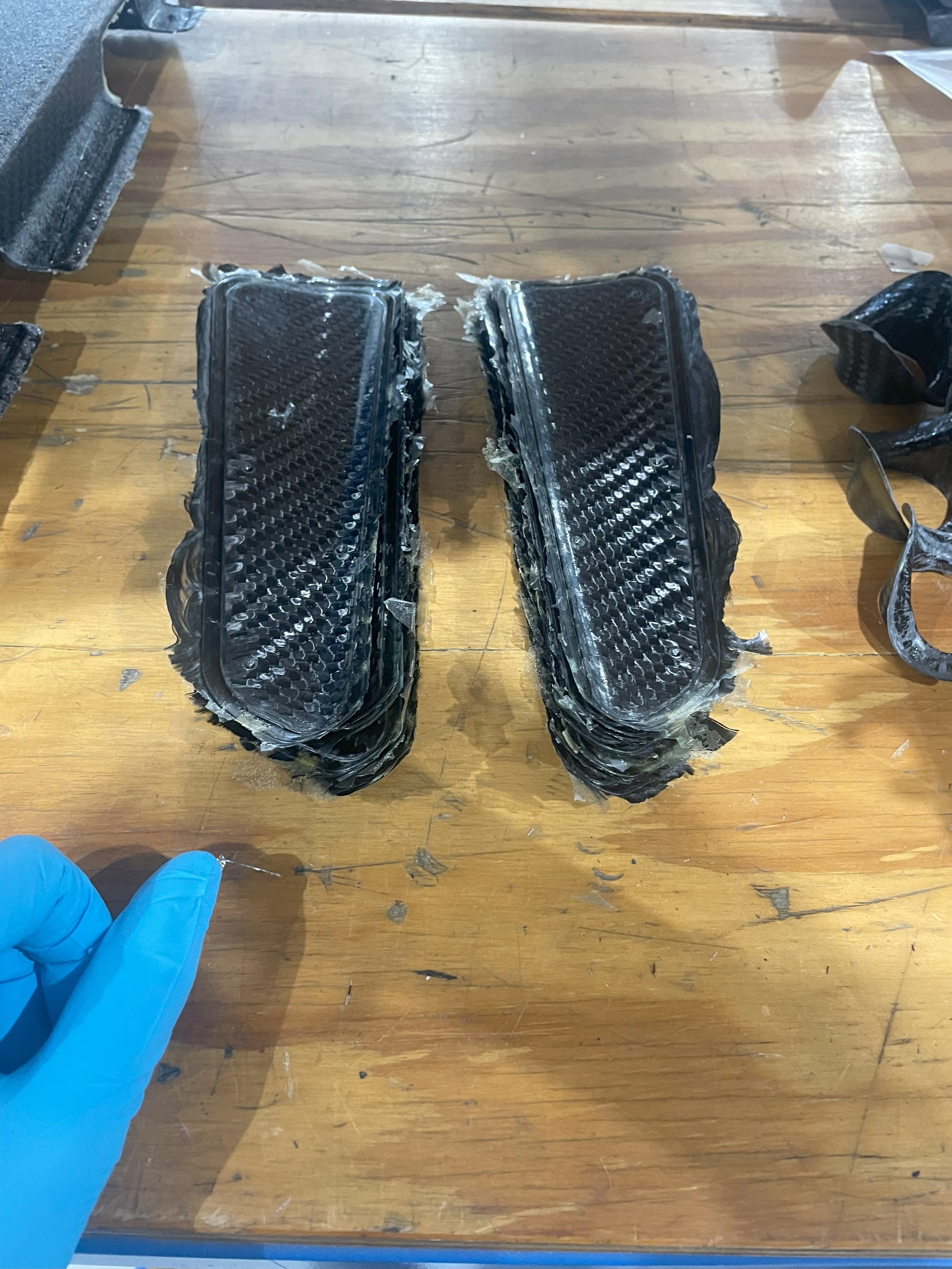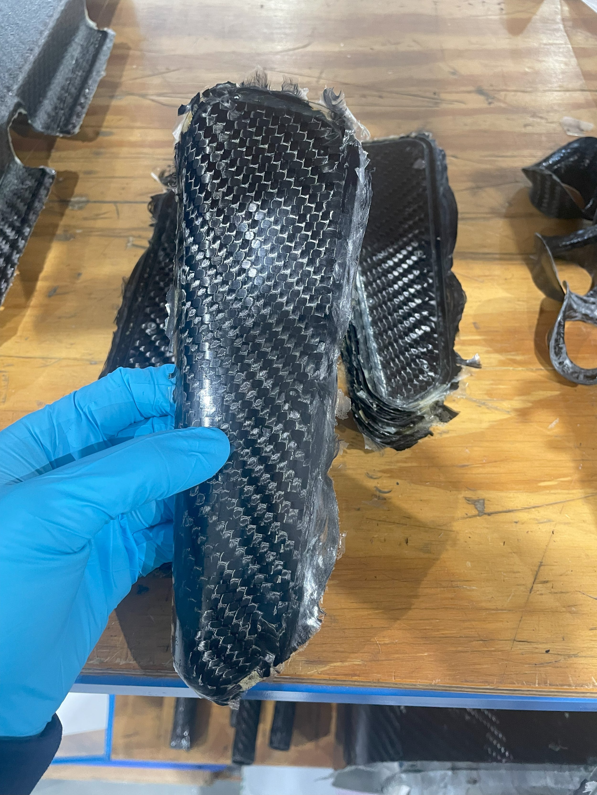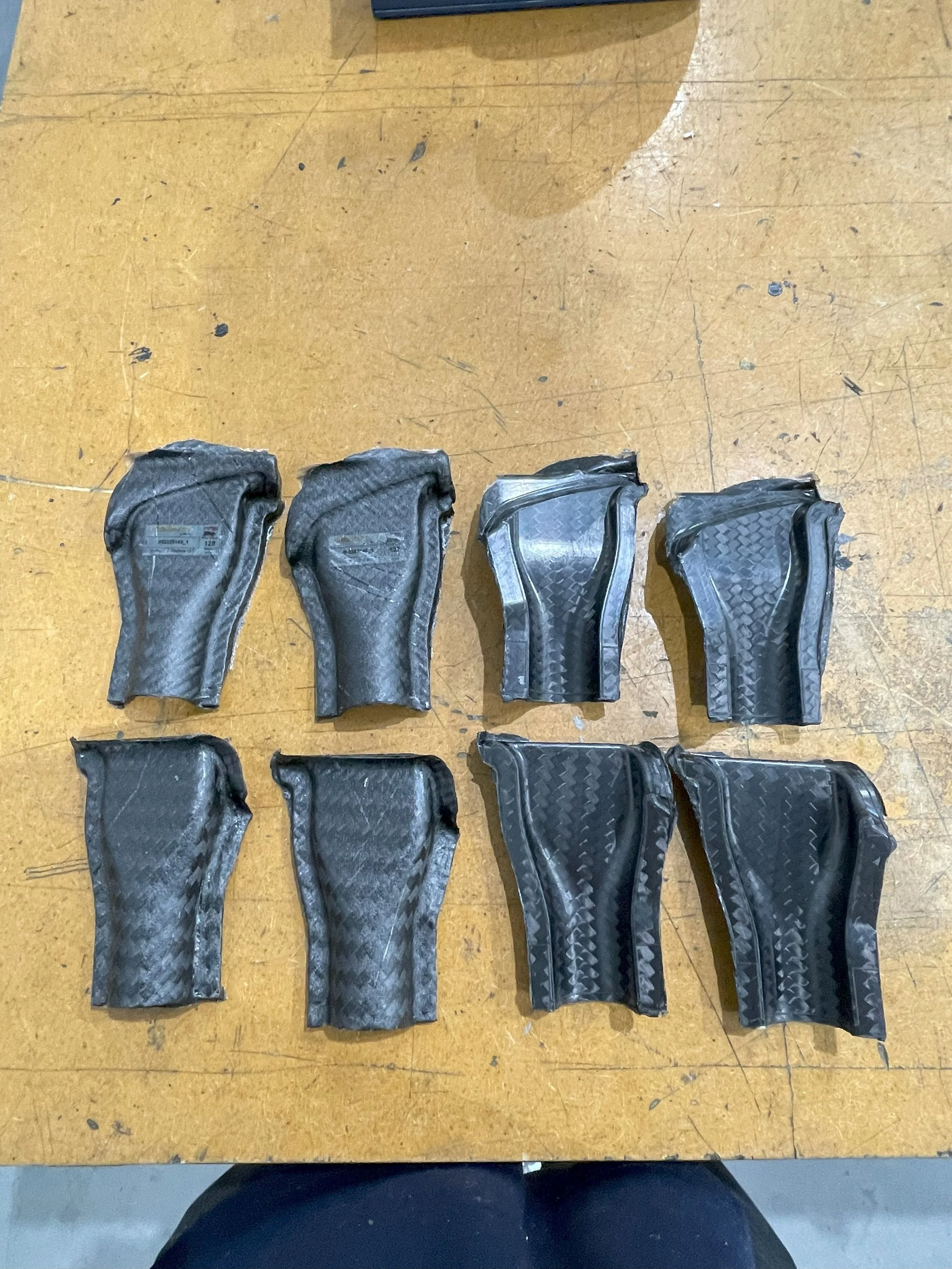 These parts were unique in their manufacturing method, done in a press machine rather than the autoclave. This method of production is significantly faster, though the parts the machine can do are greatly limited by size and complexity.