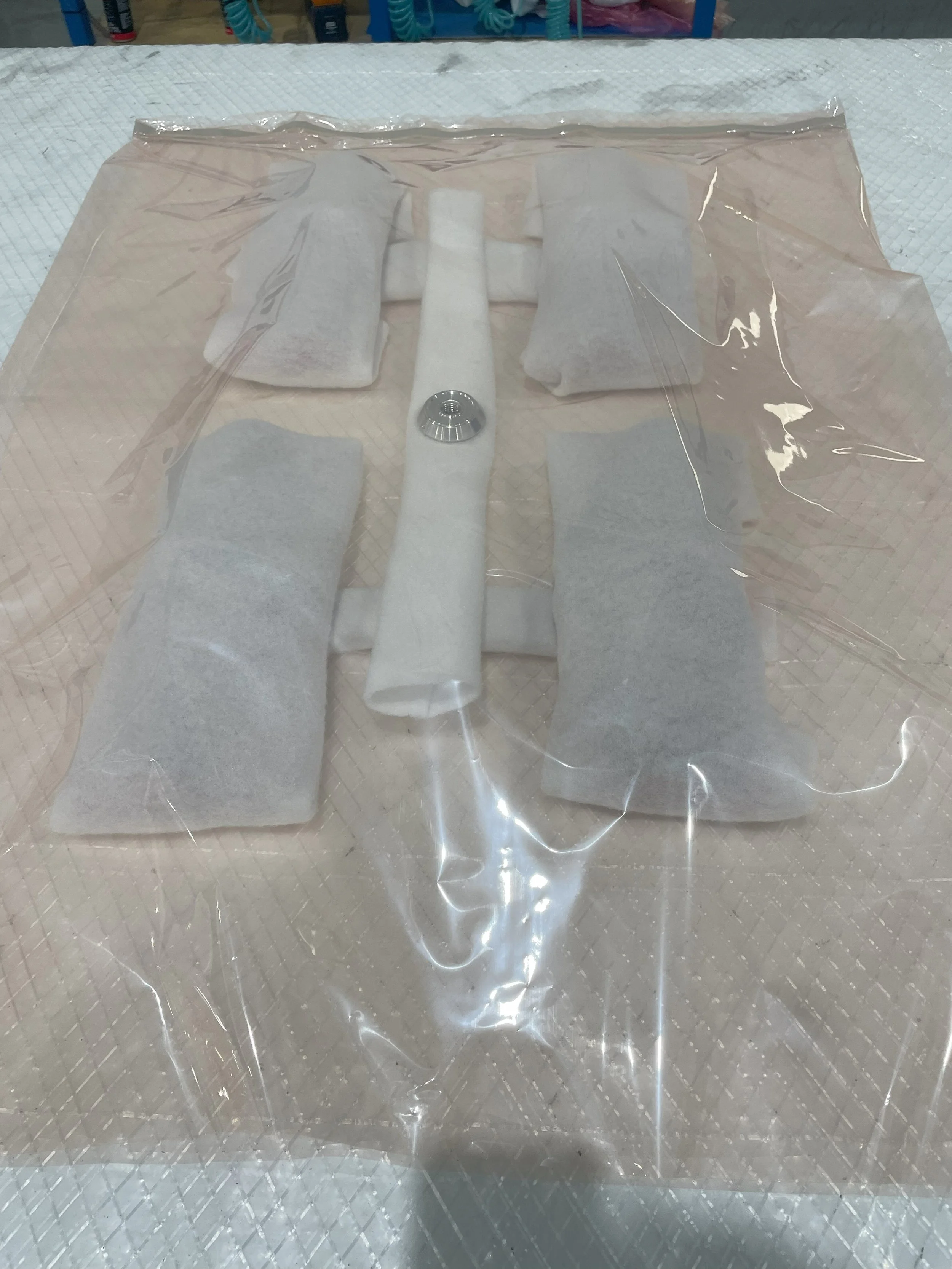 R: Mold & part wrapped in release film and breather, then bagged. All parts musts have their breather connected to the central air vacuum, hence the H pattern.