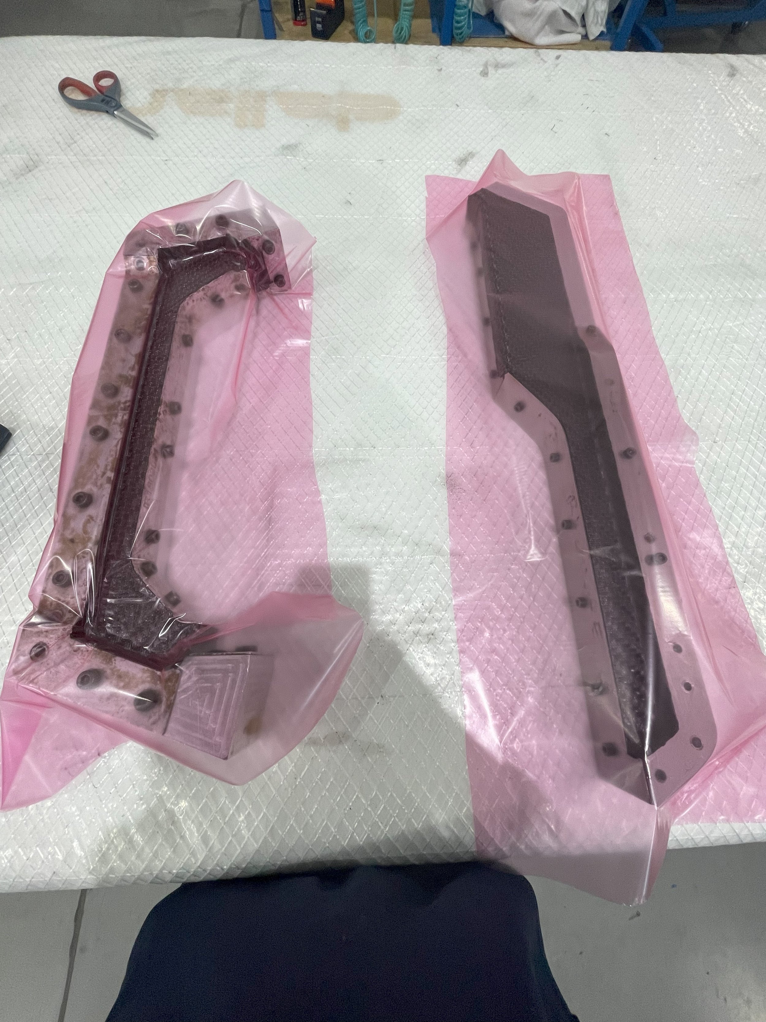 These parts were the two most complicated parts I would manufacture. Both parts have numerous tight edges and corners, with short distances of material contact on the mold in certain places making it difficult to adhere the material to the mold. This also makes the process of wrapping the release film and the breather rather complex; you must leave enough material to be compressed; this is a further headache with the mold itself. Unlike the intake ducts, the molds do not have a flat bottom or sides, meaning you must also account for material relief all the way around the mold. This must also be taken into account with the final bagging. Additionally the resin used in these cloths are stickier, in combination with the deep corners and edges this also makes laying the material much more tedious.