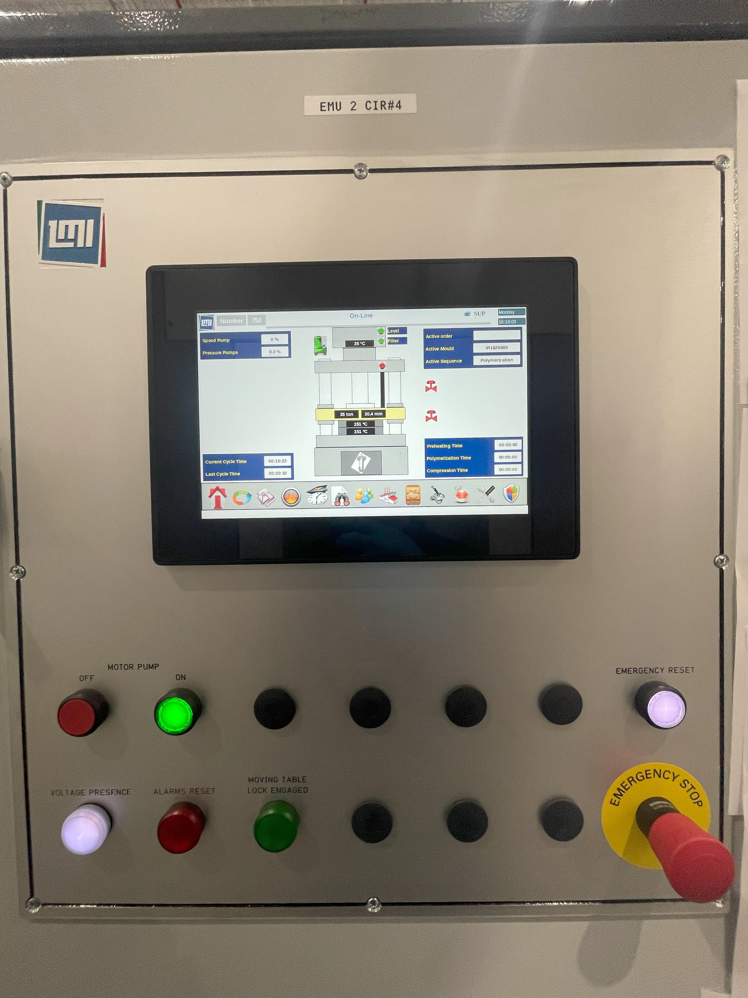 R: Control Panel for the press machine, this part ran for 20 minutes at 35 tons and 151 °C. In comparison this would take about 2 hours to cure in autoclave.